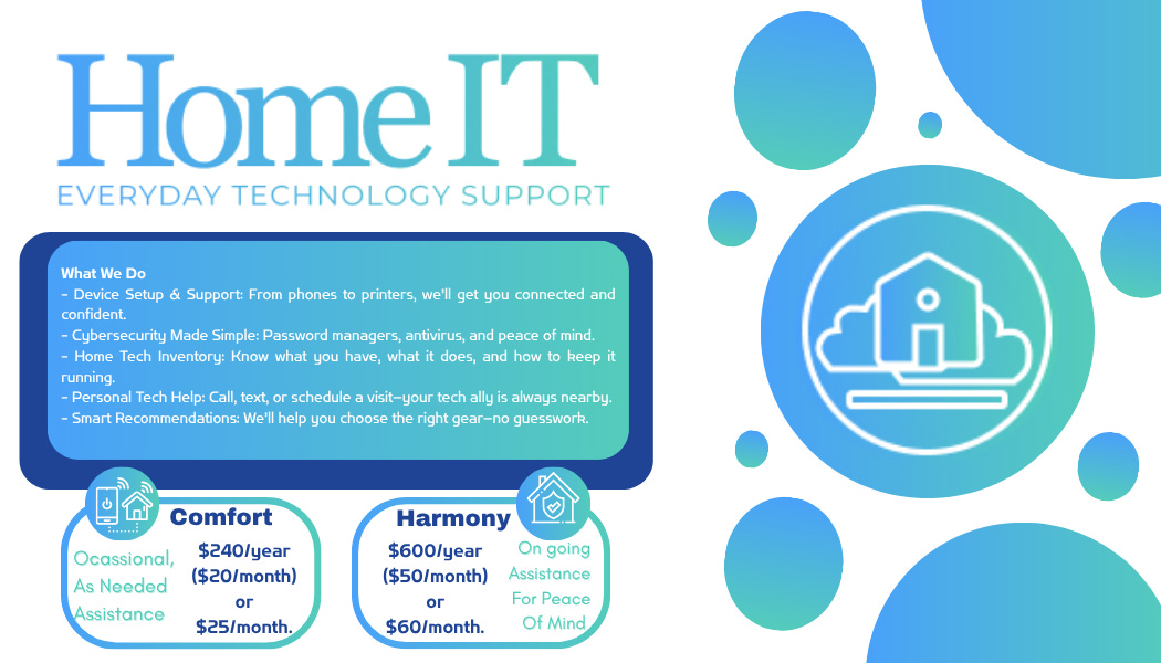 Whether your smart speaker won’t listen, your new phone is a mystery, or you’re starting to worry about password security, we’re here to make it all easier. Home IT by inWorks LLC is built for real families and real tech challenges. Our goal? To take the confusion out of your devices and give you back your peace of mind.