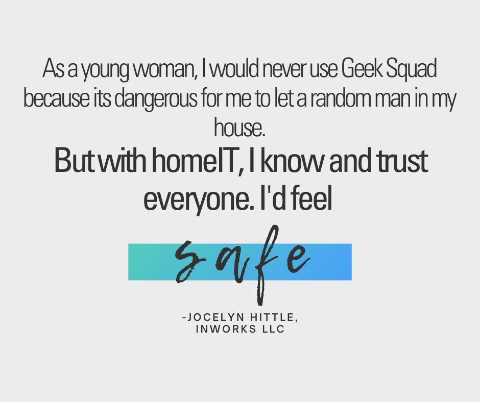 “As a young woman, I would never use Geek Squad because it’s dangerous for me to let a random man in my house. But, with homeIT, I know and trust everyone. I’d feel safe”