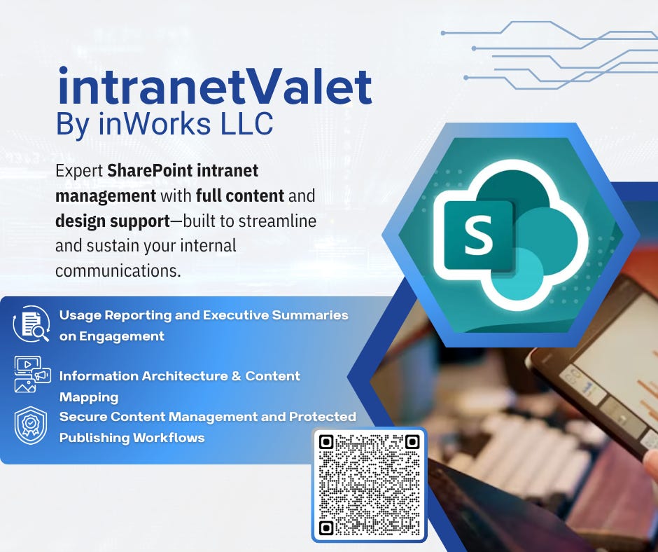 Let’s make your intranet work harder for your business. Contact intranetValet by inWorks LLC at 267-857-8066 or the QR code above and discover how smart content management can transform your internal communications.